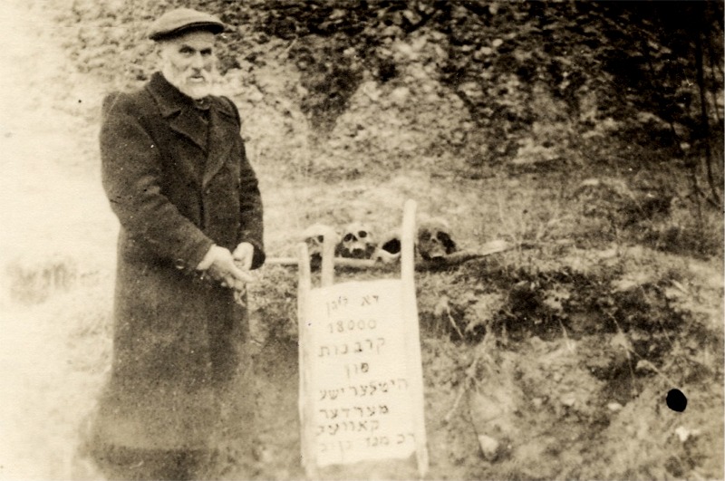 בכובה - מצבה ארעית. מתוך ארכיון לוחמי הגטאות: "ציון ארעי שהוקם בקובל מעל לקבר אחים בו נרצחו 18,000 מיהודי העיר." על המצבה נכתב (תרגום מיידיש): "כאן שוכבים 18000 קורבנות של רוצחים היטלריסטיים. קובל רכמנו בן רב" (שורה תחתונה לא ברורה) יש להניח שהצילום משנות ה- 50 המוקדמות. |