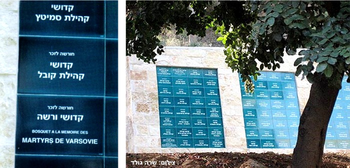 יער הקדושים - קיר הקהילות. אנדרטה לזכר קהילות שהושמדו בשואה ואנשים שנספו בה. האנדרטה מורכבת מלוחות כחולים על קיר אבן גדול, לוח לכל קהילה או אדם שתרמו עבור נטיעת עצים ביער.